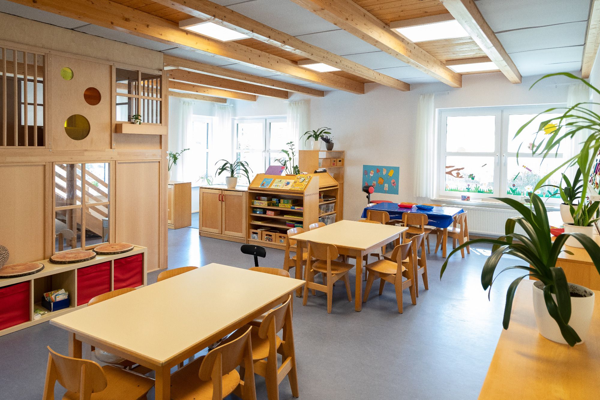 Kleingruppenangebote statt und die Nestkinder essen hier zu Mittag), die Küche, die Personaltoilette, die Cafeteria, der Eingangsbereich, der Gruppenraum der U3- und Ü3-Kinder.